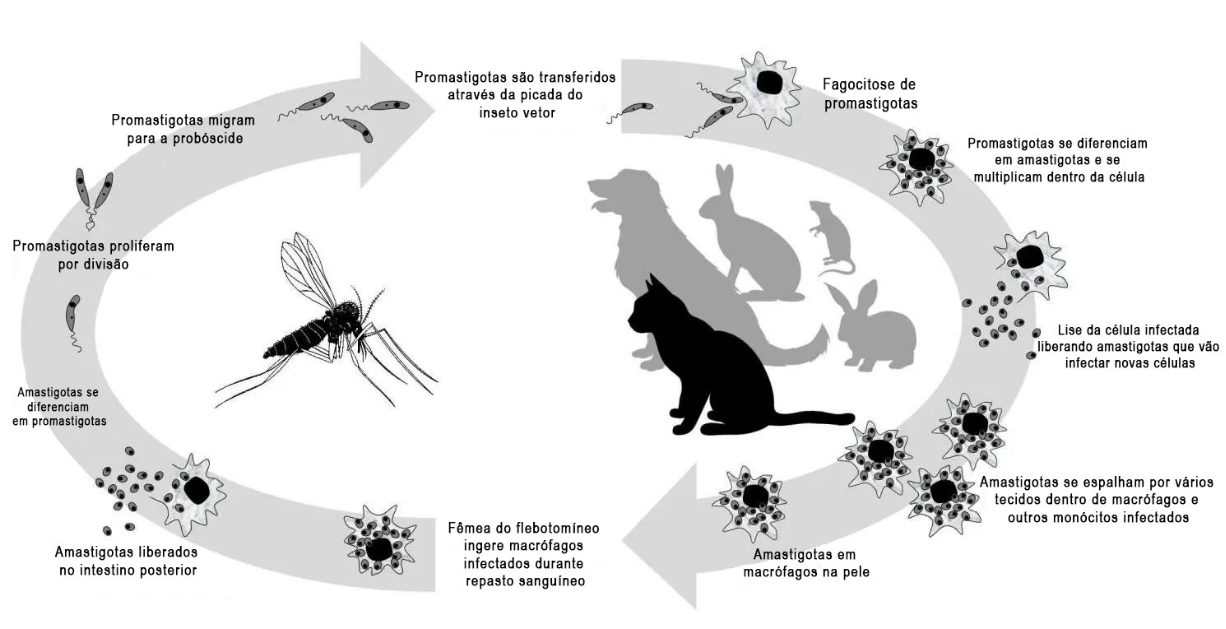 O ciclo das espécies do gênero Leishmania começa quando o vetor pica um hospedeiro infectado, ingerindo a forma amastigota do parasita. Dentro do vetor, os amastigotas se transformam em promastigotas no trato digestivo e se multiplicam. Ao picar outro hospedeiro, o inseto transmite as promastigotas, que invadem células do sistema imune e voltam a se diferenciar em amastigotas, fechando o ciclo.