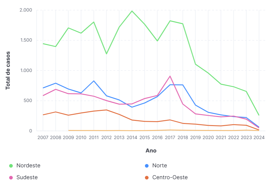 Isso contrasta com o que ocorria anteriormente, quando se registrava um aumento contínuo de casos desde o início dos anos 1980 do século XX. Apesar disso, deve-se ressaltar que a ampla ocorrência da doença no território nacional, a existência de estados com tendência de elevação nas taxas de incidência e as dificuldades e desigualdades no acesso ao diagnóstico e ao tratamento adequado fazem com que a LT também continue a ser um problema de grande relevância em nível de saúde pública no Brasil.