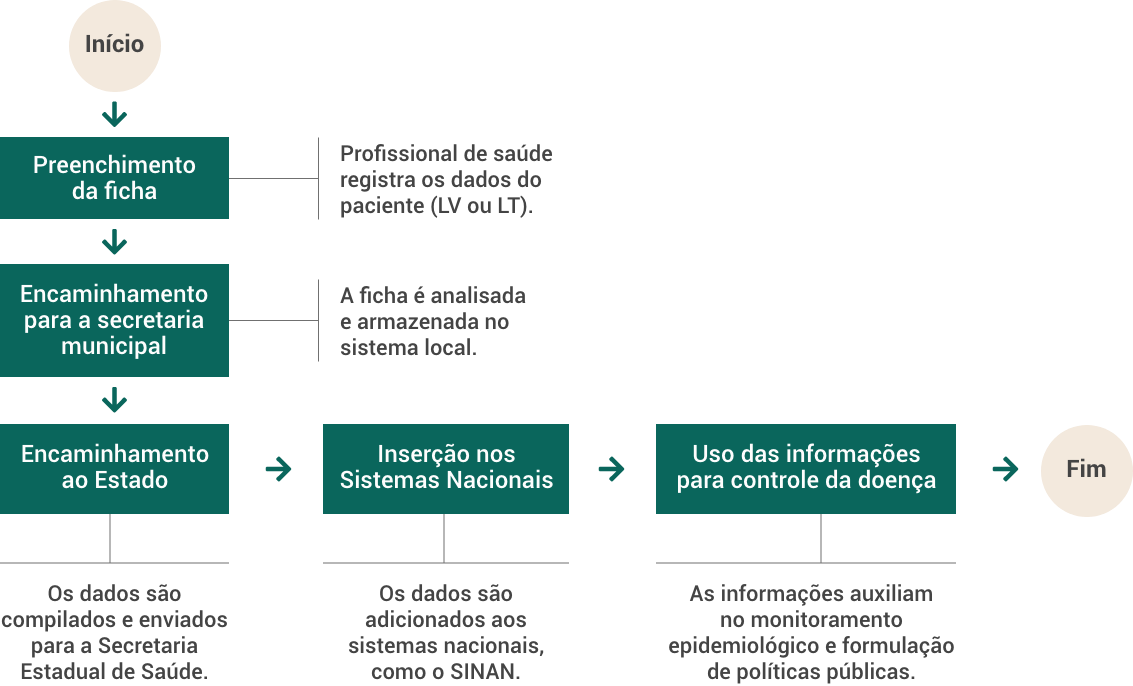 As fichas de notificação e investigação são instrumentos fundamentais para o registro de informações detalhadas sobre cada caso de LV e LT e contêm os elementos essenciais a serem coletados em uma investigação de rotina.