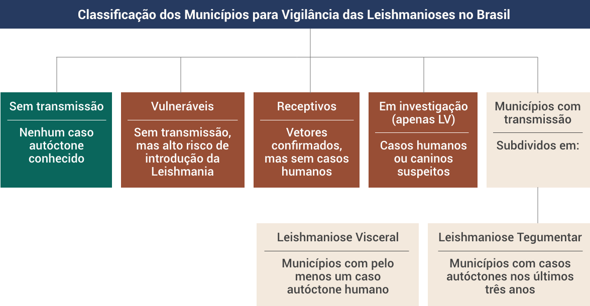 No Brasil, os municípios são classificados com base em seus perfis de transmissão de LV e LT. Assim, eles podem ser categorizados como “sem transmissão” ou “silenciosos”, caso não haja o registro de casos autóctones conhecidos, ou como “vulneráveis”, quando não há transmissão, mas existe uma alta possibilidade de introdução ou circulação de Leishmania. Os municípios podem ainda ser definidos como “receptivos”, um critério que se refere à presença confirmada de vetores. Para a LV, há ainda os “municípios em investigação”, que são aqueles onde existem casos humanos ou caninos suspeitos aguardando confirmação diagnóstica.