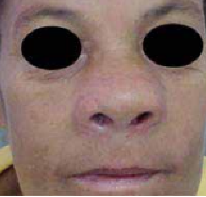 LT forma mucosa tardia: edema nasal com infiltração em asa e base do nariz