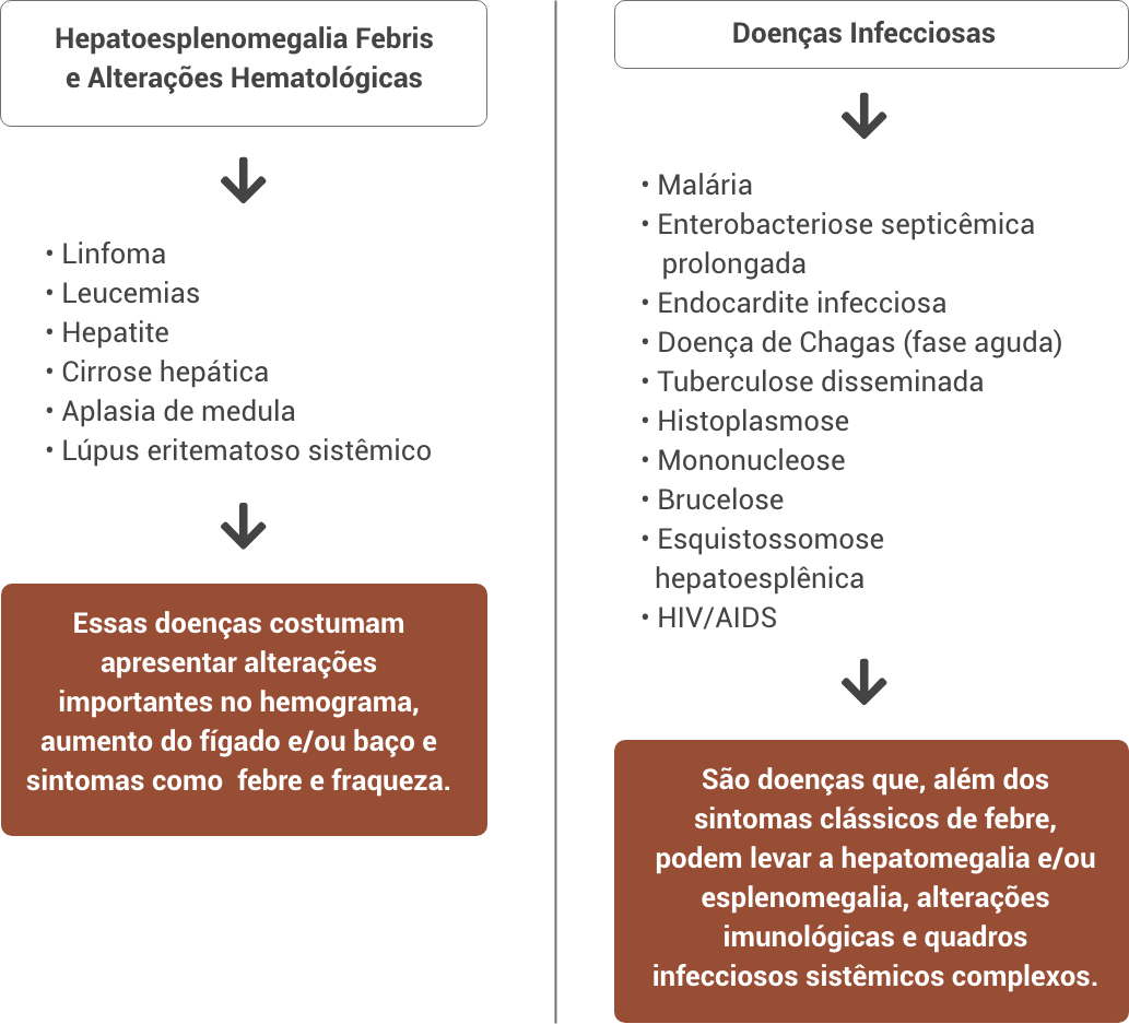 Assim como acontece com a leishmaniose visceral, várias outras doenças podem apresentar sinais e sintomas febre, hepatoesplenomegalia (aumento do tamanho do fígado e do baço) e alterações hematológicas. Assim, esses quadros precisam ser considerados no diagnóstico diferencial da leishmaniose visceral. A seguir são apresentados exemplos dessas doenças de acordo com a condição clínica ou causa.