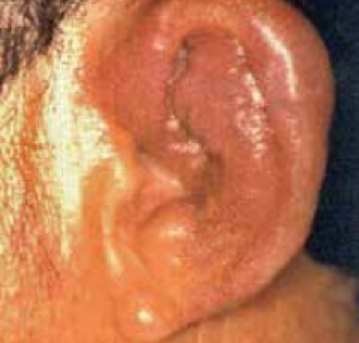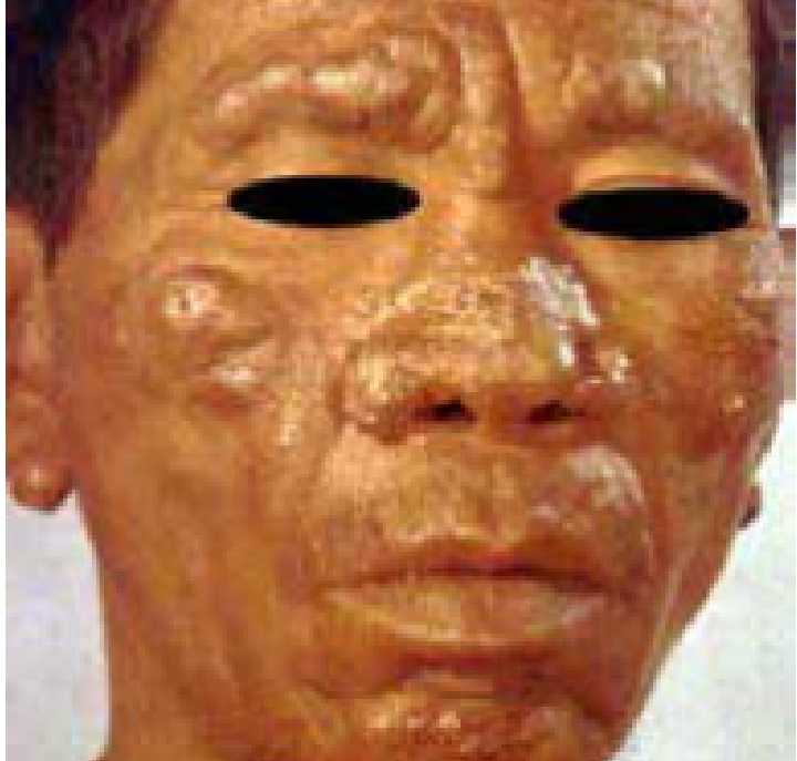 Hanseníase virchowiana: lesões pápulo-tubero-nodulares infiltrativas em toda face e orelhas, associadas a madarose