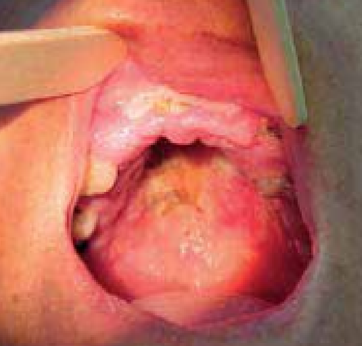 LT forma mucosa tardia: lesão ulcerada do palato mole, com bordas infiltradas recoberta por exsudato