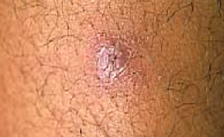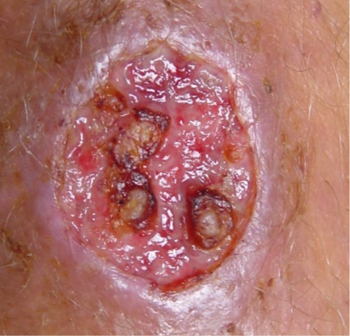 Inicialmente, pode aparecer como um nódulo (caroço), que evolui para uma úlcera de fundo granuloso e bordas elevadas (Figura 1). Também pode haver linfonodos aumentados próximos à lesão.