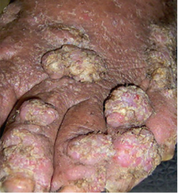 Embora menos frequentes, formas atípicas da leishmaniose tegumentar não são incomuns, principalmente em infecções causadas por Leishmania braziliensis. Essas formas podem apresentar lesões com aparência verrucosa, vegetante, ou ainda espalhadas em forma de cordões (espótrotricoide), como mostrado nas figuras 9, 10 e 11. Elas costumam surgir em pacientes com condições especiais, como imunossupressão, gestação, alcoolismo, obesidade ou diabetes.