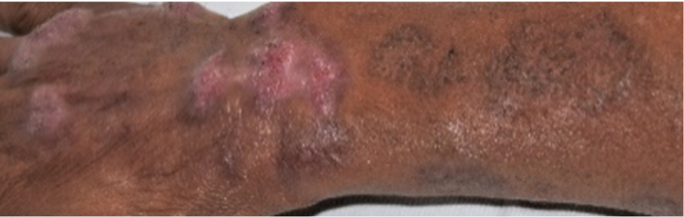 A leishmaniose cutânea difusa (LCD) é uma forma rara da doença, geralmente associada à infecção por Leishmania amazonensis, mais comum na região Norte do Brasil. Apresenta-se com nódulos e placas infiltradas espalhadas por várias partes do corpo, lembrando, em alguns casos, a hanseníase virchowiana (figura 8). Diferente de outras formas, não costuma provocar úlceras nem comprometer mucosas.