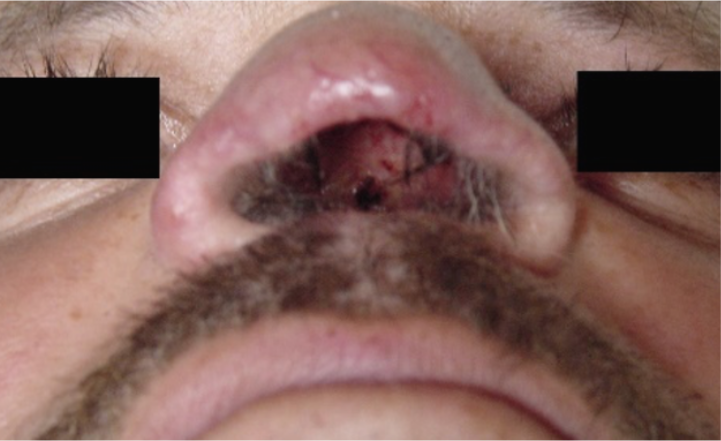 A mucosa mais atingida é a do septo nasal, ocorrendo progressivamente: infiltração, perfuração e até destruição total (Figuras 3 e 4 ). Esse comprometimento da mucosa nasal pode ser classificado em 4 estágios de acordo com a progressão e respectivas características clínicas (Figura 5). Alguns casos mais graves podem cursar com desabamento da pirâmide nasal infiltrada (nariz de Tapir); outros podem evoluir com lesões na cavidade oral, faringe, laringe, e vias áreas superiores, com rouquidão e disfagia. Os pacientes apresentam uma intensa resposta de imunidade celular e inflamatória nas lesões, com raros parasitas.