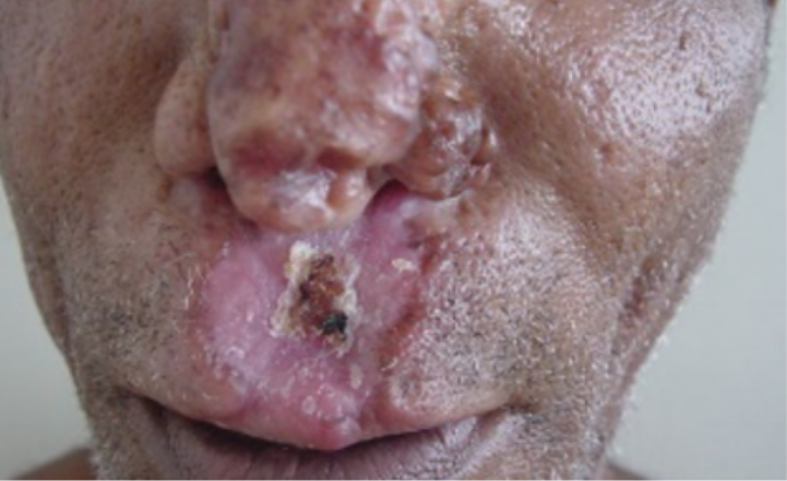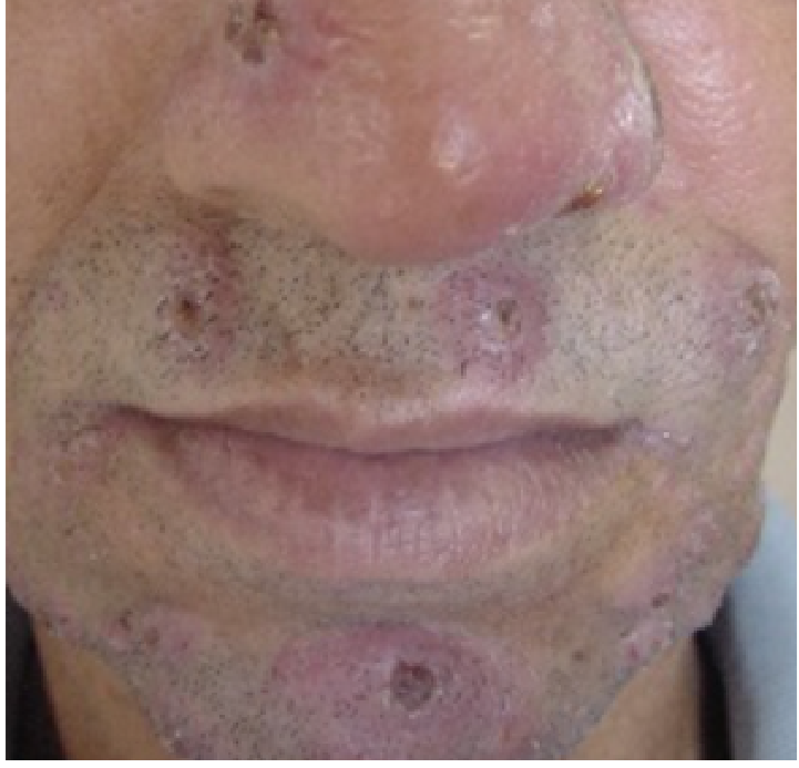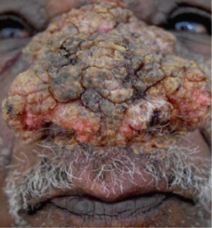 | Manifestações Clínicas | Pápulas acneiformes, pápulas inflamatórias, nódulos superficiais; úlceras; envolvimento da mucosa nasal em até 53% | Placas e nódulos infiltrados; ausência de úlceras; ausência de envolvimento da mucosa |