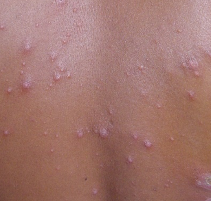 A leishmaniose disseminada (LD) é uma forma clínica caracterizada pela presença de no mínimo 10 lesões cutâneas com diferentes aspectos — como lesões do tipo acne (acneiformes), pápulas com crostas inflamatórias, nódulos superficiais e úlceras — espalhadas por ao menos duas áreas do corpo que não se tocam entre si. Em casos mais avançados, os pacientes podem apresentar dezenas ou até centenas de lesões espalhadas por todo o corpo (Figuras 5, 6 e 7).